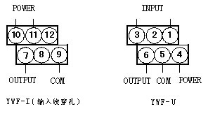 注: 1、YWF、YWL系列交流电流变送器输入线从变送器外壳设置的穿孔穿过,不分极性。