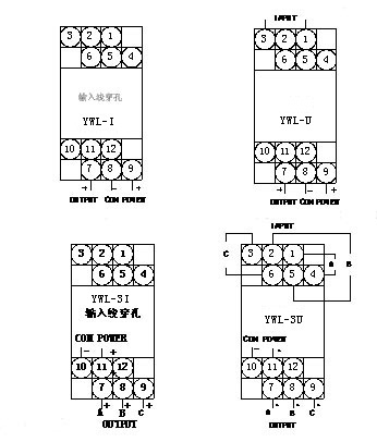 注: 1、YWF、YWL系列交流电流变送器输入线从变送器外壳设置的穿孔穿过,不分极性。